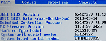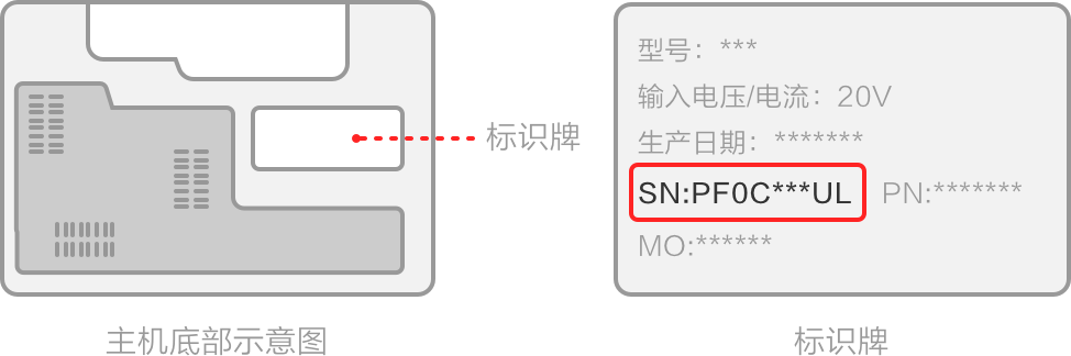 标识牌中包括包含主机编号,主机型号和生产日期等信息,其中S/N后面的信息为主机编号,以PF、R3,R0、S1、等开头,共计8位,数字和字母组成。(见主机底部标识牌示意)